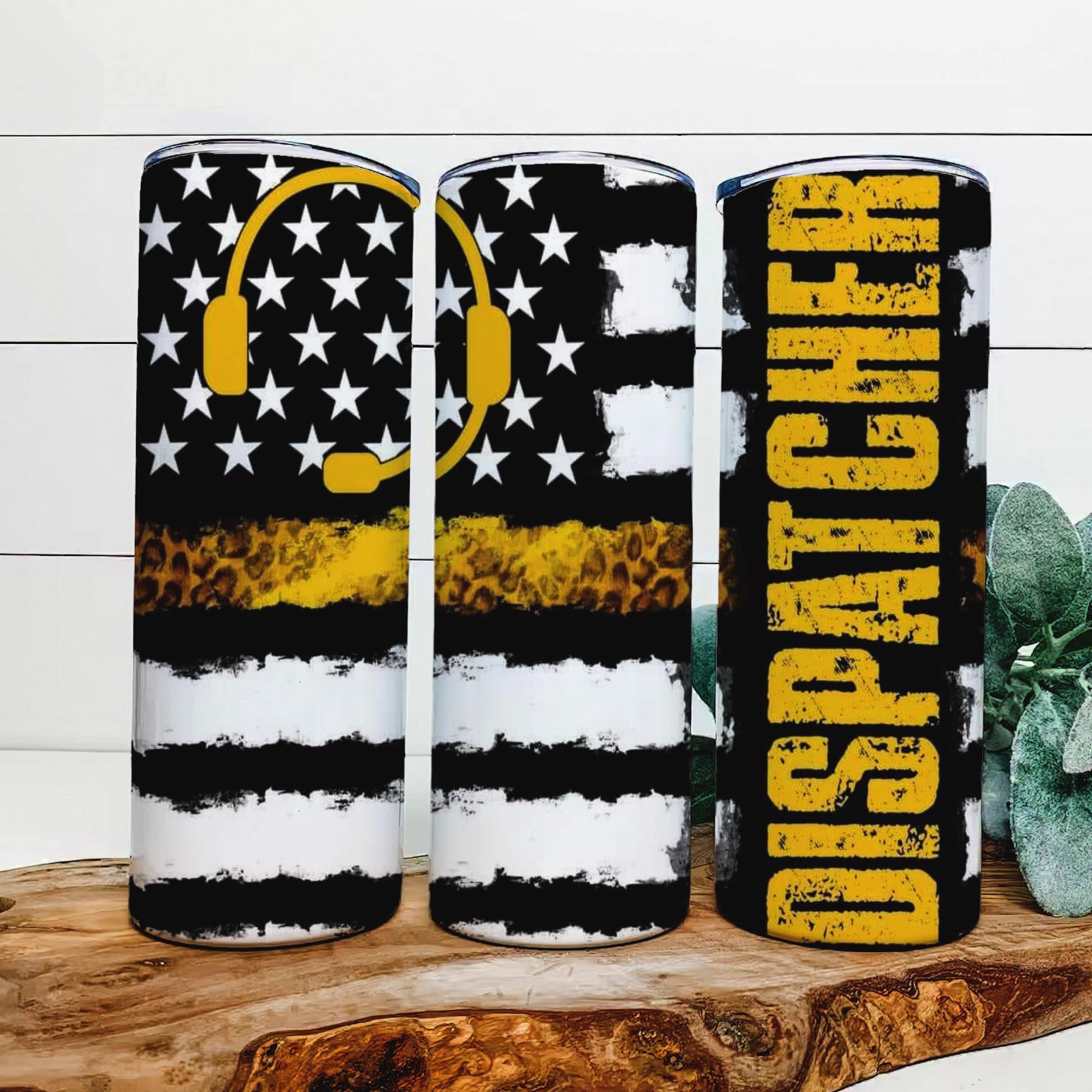 This Black, White, and Yellow Dispatcher Tumbler is perfect for any proud dispatcher. The high-quality stainless steel construction features a patriotic American Flag design with a headset and the word "DISPATCHER". Keep your drinks insulated and spill-free with the included lid and straw. Comes in a presentation box, making it a perfect gift.
