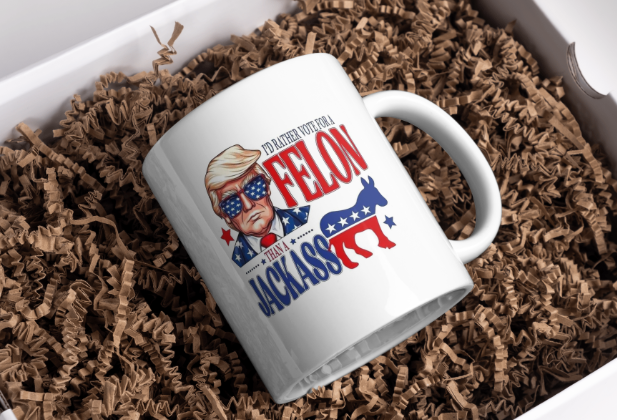 This 15oz ceramic coffee mug boldly states "I'd Rather Vote for a Felon than a Jackass" with a picture of Trump. Perfect for those who are fed up with traditional politics. Show off your rebellious and opinionated side while sipping your favorite beverage.
