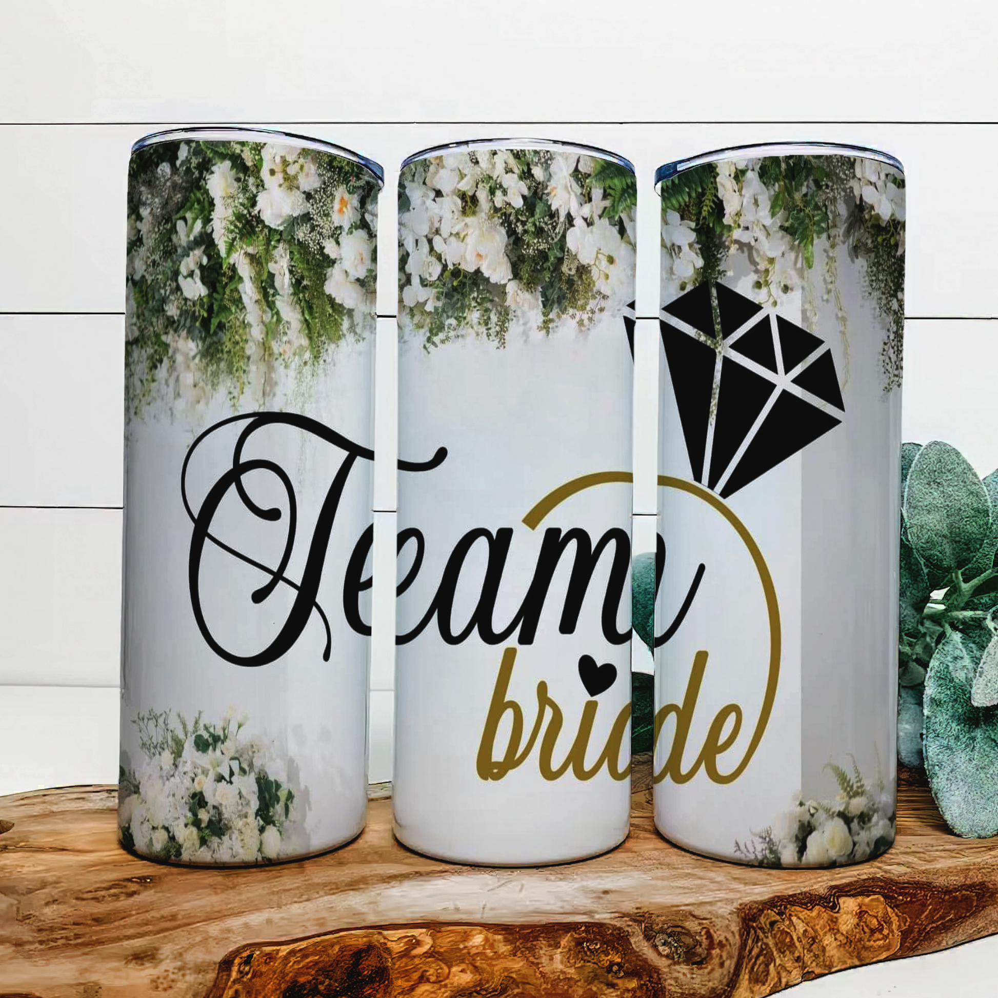 Keep your drinks at the perfect temperature with our Team Bride Tumbler. This stylish 20oz insulated tumbler features a beautiful wedding flower design and incorporates an elegant engagement ring. Comes with a convenient lid, straw, and box for easy on-the-go use. Stay hydrated and show off your engagement status in style.