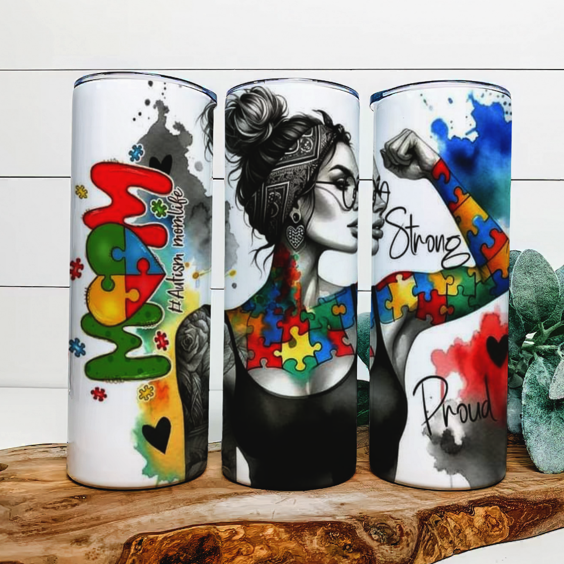 Stay hydrated while showing support for autism awareness with our 20oz insulated Autism Mom Tumbler. Includes a convenient lid and straw, perfect for on-the-go use. The design features a woman and autism awareness puzzle pieces. Show your love and dedication to the cause with this stylish tumbler.